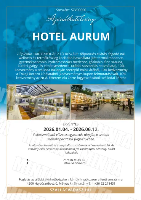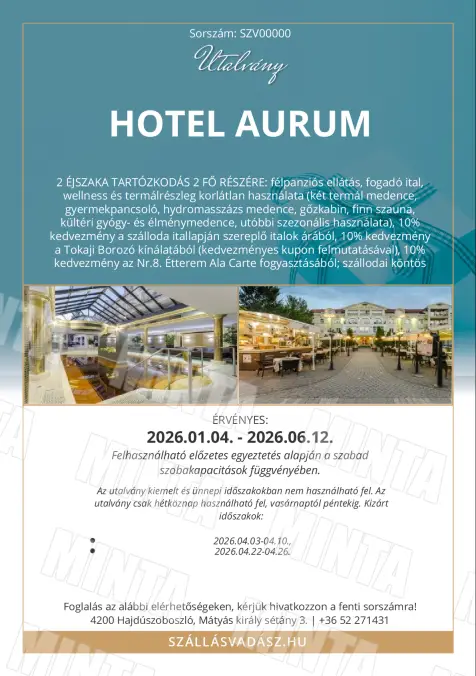 Az utalvány 2026.01.04. és 2026.06.12. között használható fel, szabad szobakapacitás függvényében, a szállodával előre egyeztetett időpontban.