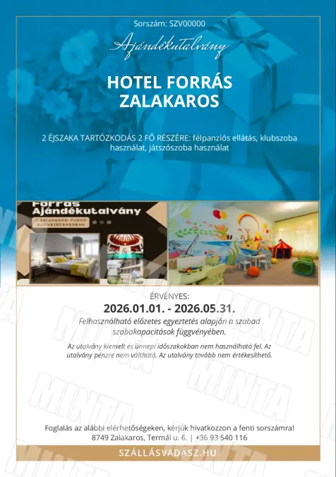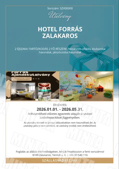 Az utalvány 2026.01.01. és 2026.05.31. között használható fel, szabad szobakapacitás függvényében, a szállodával előre egyeztetett időpontban.
