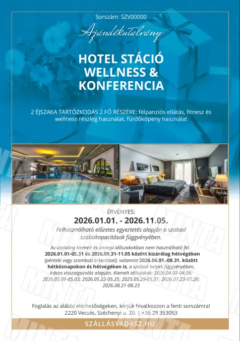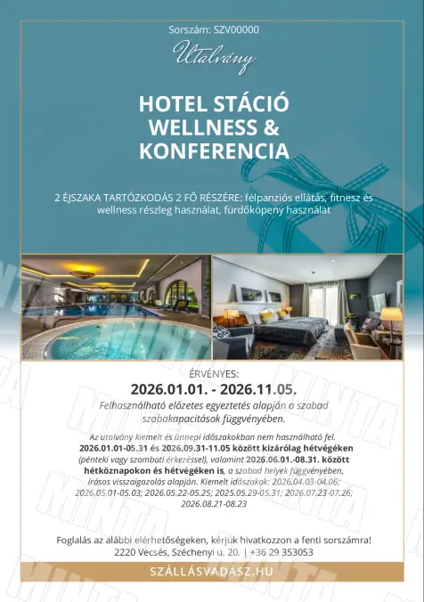 Az utalvány 2026.01.01. és 2026.11.05. között használható fel, szabad szobakapacitás függvényében, a szállodával előre egyeztetett időpontban.