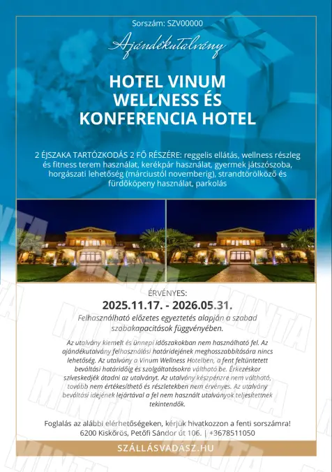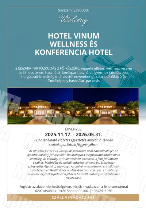 Az utalvány 2026.05.31-ig használható fel, szabad szobakapacitás függvényében, a szállodával előre egyeztetett időpontban.