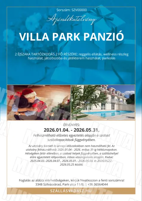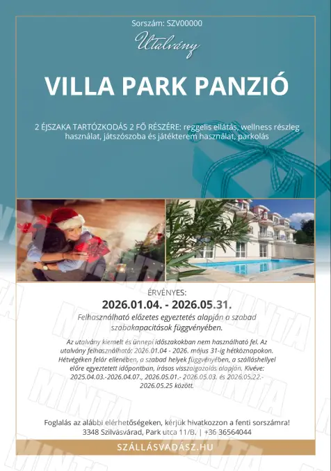 Az utalvány felhasználható: 2026.01.04 - 2026. május 31-ig hétköznapokon. Hétvégéken felár ellenében, a szabad helyek függvényében, a szálláshellyel előre egyeztetett időpontban, írásos visszaigazolás alapján. Kivéve: 2025.04.03.-2026.04.07., 2026.05.01.- 2026.05.03. és 2026.05.22.- 2026.05.25 között.
